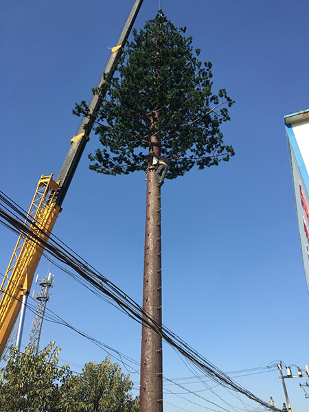 仿生樹,又叫仿生塔、仿生通訊塔,屬于通信發(fā)射塔技術領域。是讓通信鐵塔與周圍的自然環(huán)境相協(xié)調,有效地解決了風景區(qū)等地建站難的問題,其優(yōu)點是保持了原有單管塔的所有優(yōu)點,在其外形上作了重大的突破、改進,以自然生長的松樹,樟樹等為仿真的造型樣本,設計素描圖和電腦效果圖,制訂雕塑和噴涂工藝程序,對單管塔仿真?zhèn)窝b,使人們察覺不到塔的存在,把它融入了周圍的自然環(huán)境中。
