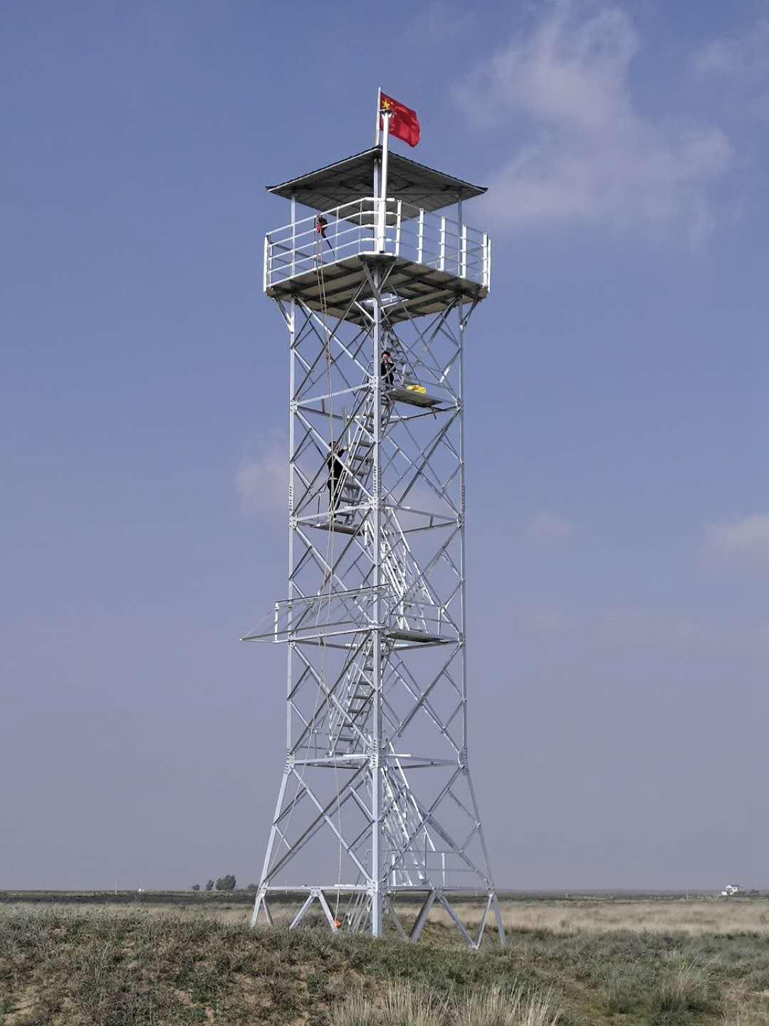 瞭望塔結(jié)構(gòu)一般為鋼結(jié)構(gòu)塔架,拆、裝方便。平面為四邊形自立式或拉線式。主體曲線一般為折線形,內(nèi)部結(jié)構(gòu)為交叉式。上部設(shè)工作平臺(tái)或值勤房。內(nèi)部設(shè)有斜向爬梯或旋轉(zhuǎn)爬梯。
